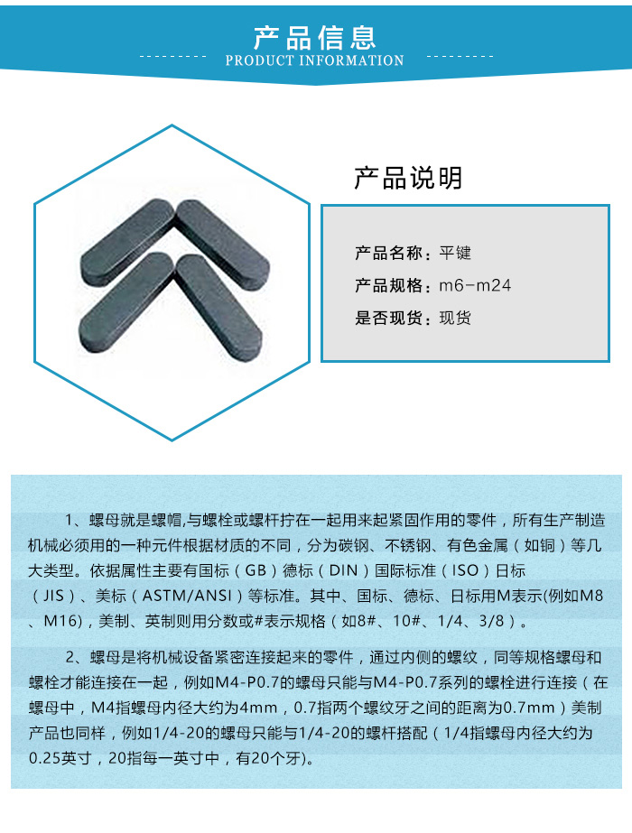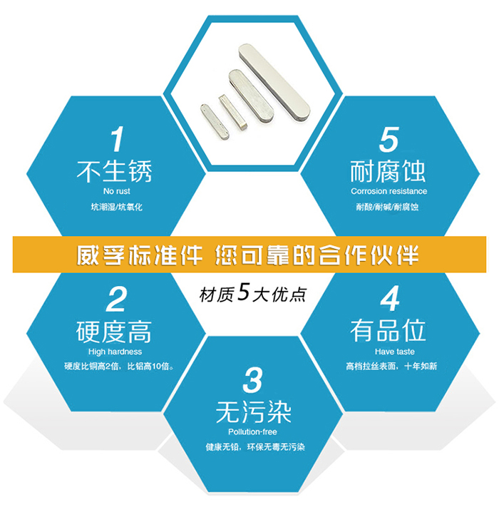76.DIN6885平鍵,是依靠兩個側面作為工作面,靠鍵與鍵槽側面的擠壓來傳遞轉矩的鍵。76.DIN6885平鍵分為普通型76.DIN6885平鍵、薄型76.DIN6885平鍵、導向型76.DIN6885平鍵三種。普通型76.DIN6885平鍵對中性好,定位精度高,折裝方便,但無法實現軸上零件的軸向固定,用于高速或承受沖擊、變載荷的軸;薄型76.DIN6885平鍵用于薄壁結構和傳遞轉矩較小的地方;導向型76.DIN6885平鍵用螺釘把鍵固定在軸上,用于軸上的零件沿軸移動量不大的場合;導向鍵還包括滑鍵,它固定在輪轂上,軸上零件帶著鍵作軸向移動,用于軸上零件沿軸移動量較大的場合。