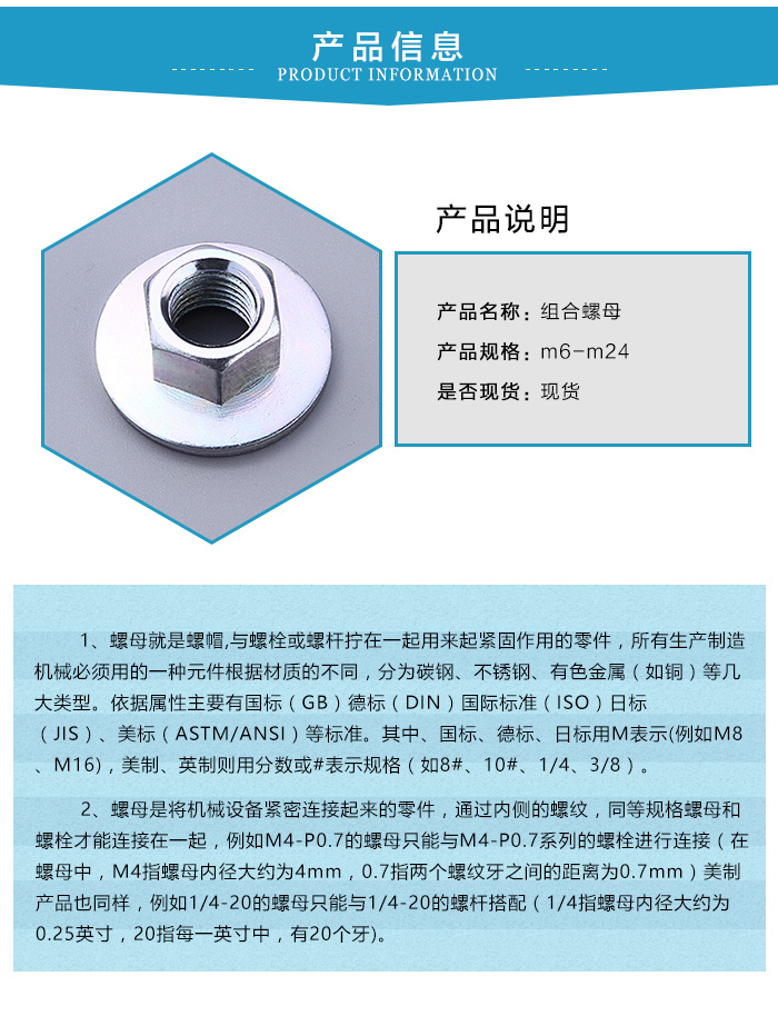 組合螺母是指一個外六角螺栓配上一個彈墊和一個平墊組合搓牙緊固在一起的三組合件。組合螺母也叫外六角組合螺釘,也叫六角組合螺母。其國標有兩種,一種是十字槽外六角組合組合螺母的電鍍有環保與非環保,也就是普通的。組合螺母常用環保電鍍有環保彩鋅,環保蘭鋅,環保白鋅,環保鎳等,組合螺母非環保的有彩鋅,白鋅,黑鋅,白鎳等,組合螺母電鍍后的鹽霧測試時間,一般環保彩鋅,環保蘭鋅都可過鹽霧72個小時,環保白鋅的鹽霧比較差,才6-8個小時。螺栓,國標號為GB9074.13.別一種是不帶十字槽外六角組合螺母。叫作切邊外六角組合螺母。