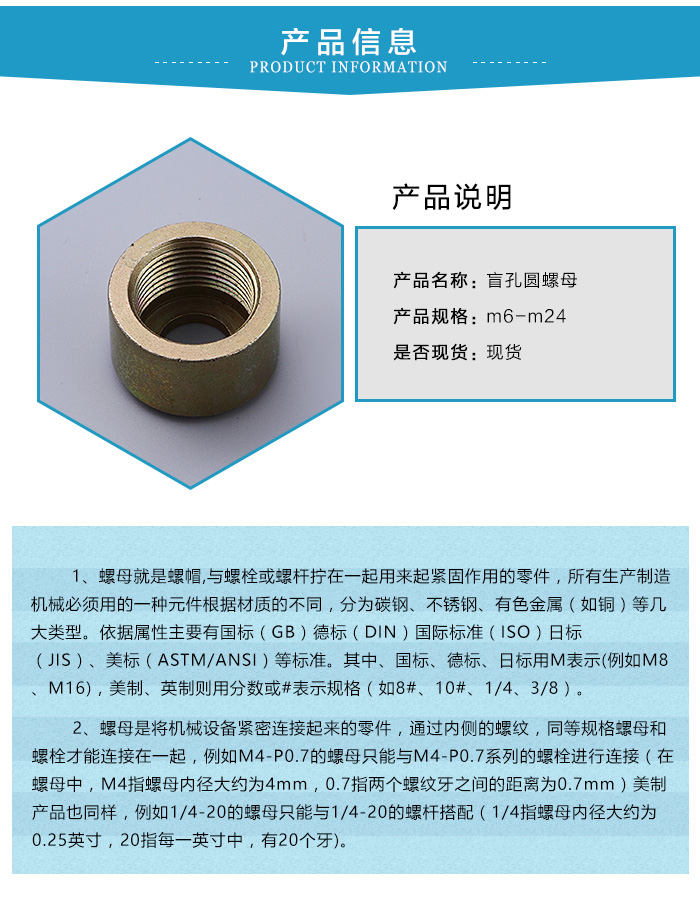 盲孔圓螺母是將機械設備緊密連接起來的零件,通過內側的螺紋,同等規格盲孔圓螺母和螺絲,才能連接在一起,例如M4-0.7的盲孔圓螺母只能與M4-0.7的螺桿搭配(在盲孔圓螺母中,M4指盲孔圓螺母內徑大約為4mm,0.7指兩個螺紋牙之間的距離為0.7mm);美制產品也同樣,例如1/4-20的盲孔圓螺母只能與1/4-20的螺桿搭配(1/4指盲孔圓螺母內徑大約為0.25英寸,20指每一英寸中,有20個牙)。