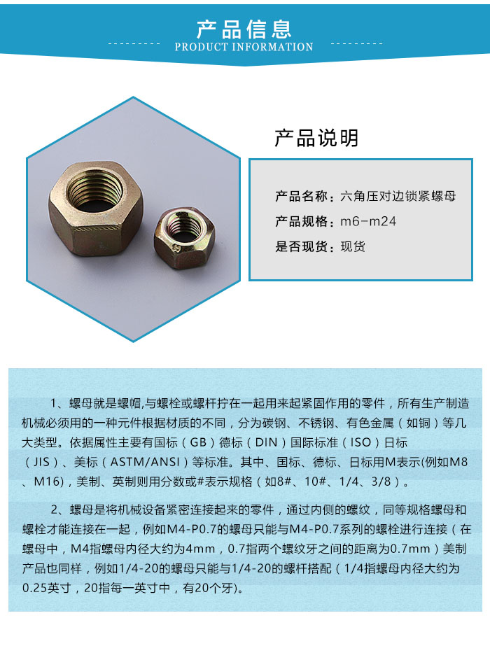 市場上銷售的質量比較好的六角壓對邊六角壓對邊鎖緊螺母在螺母的內圓面鑲有與該六角壓對邊六角壓對邊鎖緊螺母螺紋一致的銅制小塊,用于避免徑向頂緊螺釘直接與被鎖螺紋接觸而損壞后者。這種六角壓對邊六角壓對邊鎖緊螺母在旋轉運動類零件的軸端鎖緊場合逐步開始應用,比如滾珠絲杠安裝端軸承的防松。