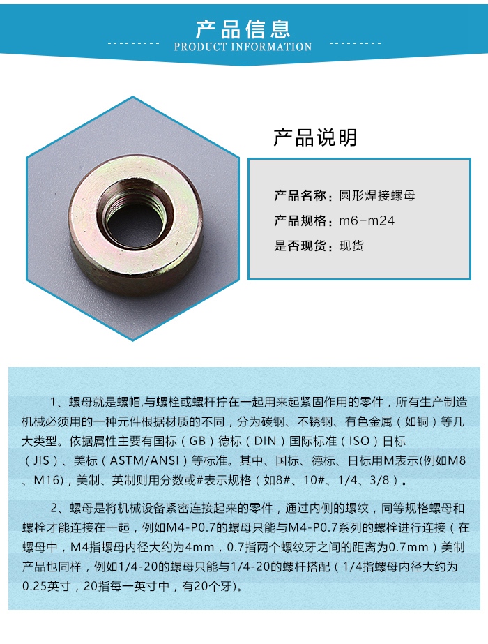 圓形焊接螺母被使用的范圍非常廣泛,是螺母中的一種,而且雖說焊接螺母的強度大,不易松脫,但在使用過程中還需要注意一些事項,以便焊接螺母連接使用。所謂焊接就是把兩個分離件變成一個整體,用高溫將金屬融化后混合到一起在冷卻,中間會加入合金,內部是分子力的作用,要比一般母體輕度大。