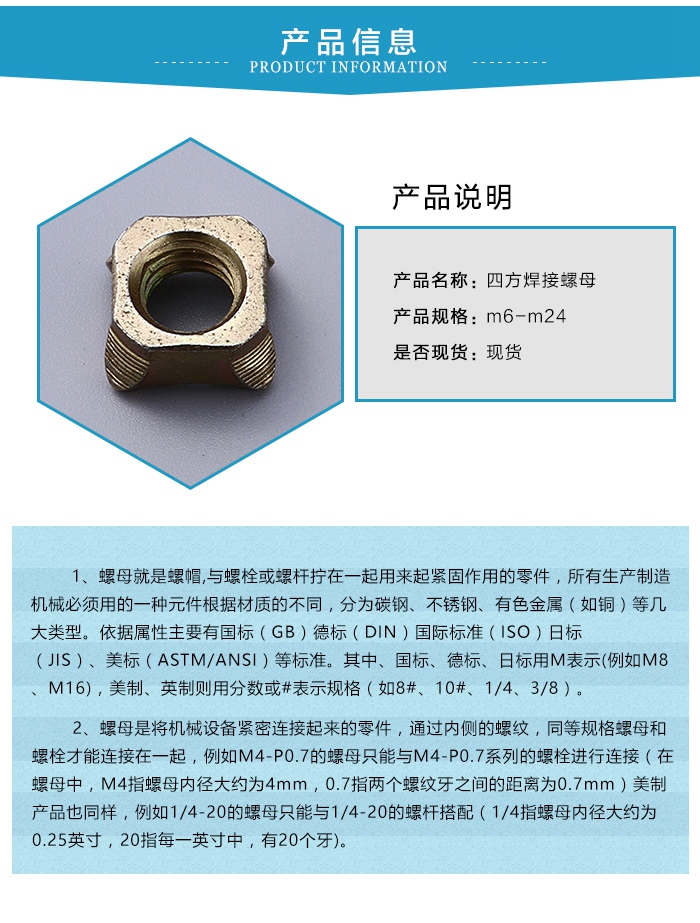 四方焊接螺母是被焊工件的材質(zhì)(同種或異種),通過(guò)加熱或加壓或兩者并用,并且用或不用填充材料,使工件的材質(zhì)達(dá)到原子間的建和而形成性連接的工藝過(guò)程, 焊接螺母是具有內(nèi)螺紋并與螺栓配合使用的緊固件。具有內(nèi)螺紋并與螺桿配合使用用以傳遞運(yùn)動(dòng)或動(dòng)力的機(jī)械零件。