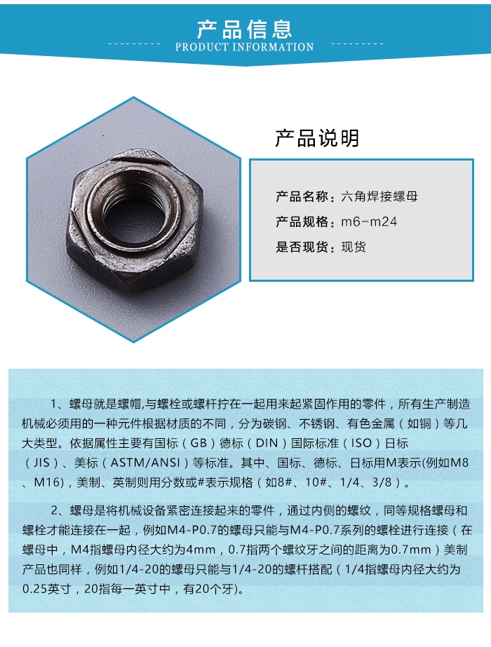 六角焊接螺母有四個標準,國標GB(GB/T)、日標(JB)、德標(DIN)、英標(BS)。它是一種在螺母外適合焊接的螺母,通常來說是把兩個東西通過高溫融化后經過冷卻,然后融為一體。而且中間中間會加入合金,內部是分子力的作用,強度一般比母體強度大[1] 。焊接參數的實驗要看焊縫的熔合大小,根據熔合大小調節焊接參數,直到消除缺陷。當然焊接質量的好壞與焊前處理有關,清灰、油漬等。