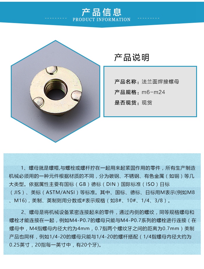 法蘭面焊接螺母是一種在螺母外適合焊接的螺母,一般是可焊接的材料制成的而且較厚適與焊接,焊接是相當于把兩個分離件變成一個整體,用高溫將金屬融化后混合到一起再冷卻,中間會加入合金,內部是分子力的作用,強度一般比母體強度大。
