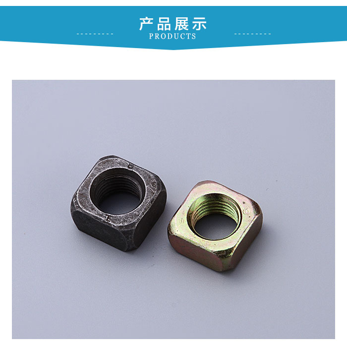 方形螺母表面處理采用:電鍍白鋅,藍白鋅,五彩鋅,發黑,本色五種表面處理方式可選。
