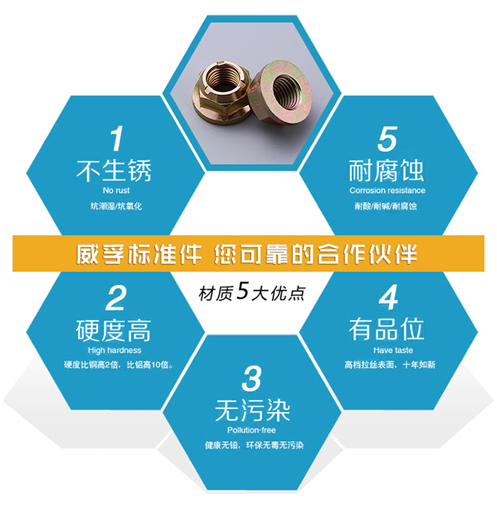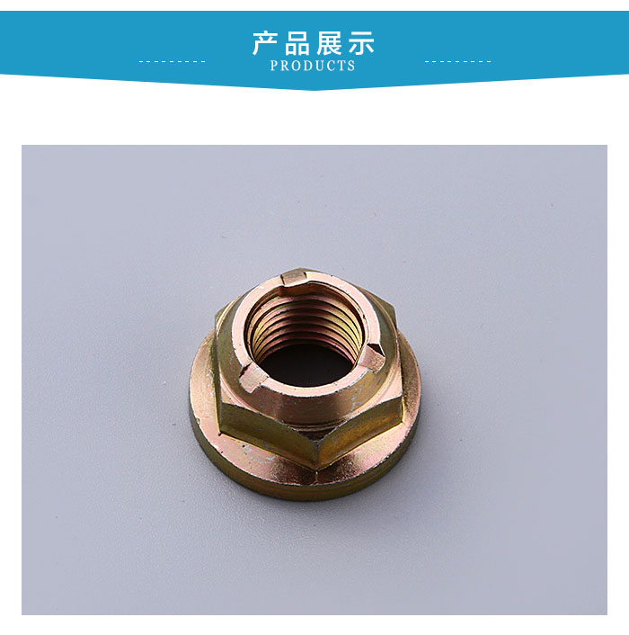 當有振動發生時防松螺母凸起部分相互錯動,產生抬升張力,從而達到不錯的防松效果。法蘭面壓三點緊鎖螺母有鐵的,也有不銹鋼的。但鐵的比較常用。而且還可以根據客戶所需要的色彩進行電鍍處理。一般電鍍處理有環保和非環保的。電鍍有環保彩鋅,環保鎳,環保蘭鋅,環保黑鋅等,也有普通的電鍍,白鋅,彩鋅,黑鋅,白鎳等。