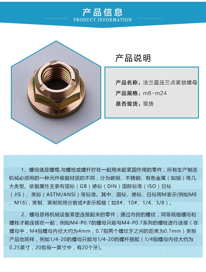 法蘭面壓三點緊鎖螺母和一般的六角螺母尺寸與螺紋規格基本相同,只不過比六角螺母相比,它是墊片和螺母是一體式的,而且在下面有防滑的齒紋,這樣增大了螺母與工件的表面積接觸,相比普通螺母加墊圈的組合,更加牢固和拉力更大。