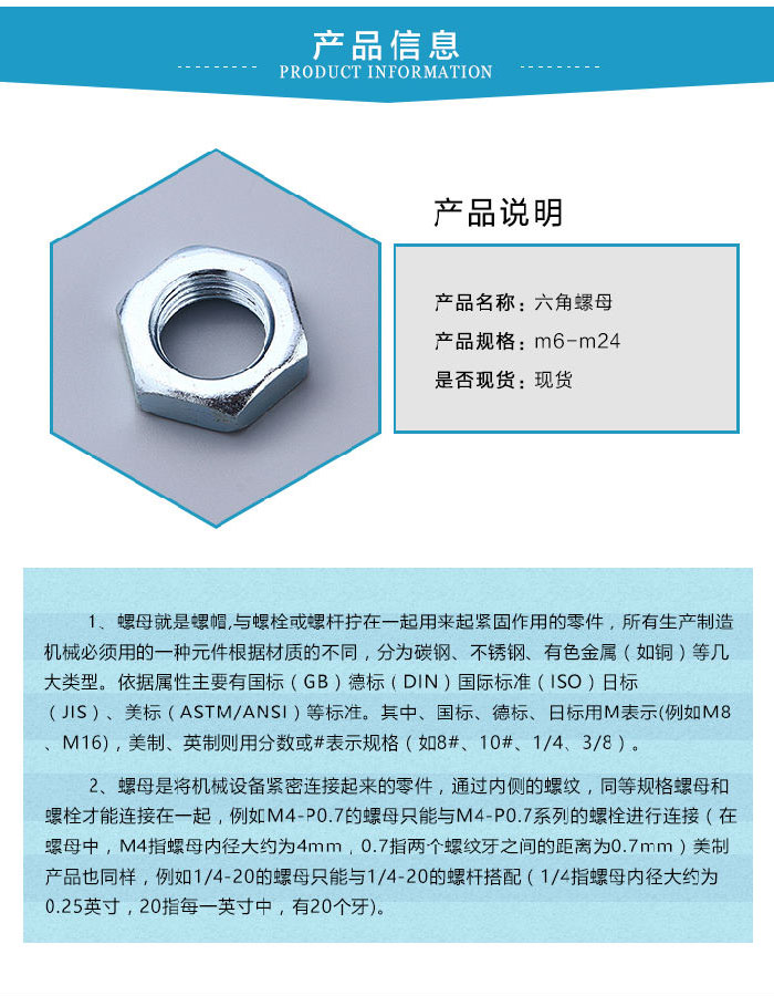 六角螺母作為一種標準件,它就應當有自己的通用規格。六角螺母對于六角螺帽,常用的標準有:GB52、GB6170、GB6172和DIN934,對于它們之間的主要區別有:GB6170的厚度要比GB52、GB6172和DIN934來的厚,俗稱為厚螺帽。